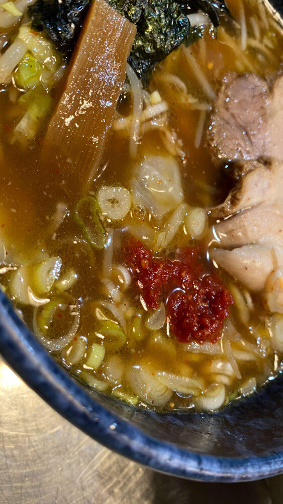 ▲終盤はつけ汁に卓上の豆板醤で辛さアップ!食欲増進でラストスパートします。