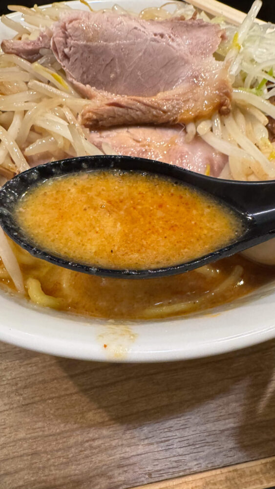 ▲スープは辛味噌がベースですが、ほんのり玉子とじっぽい感じで辛味噌ラーメンより控えめのピリ辛テイスト。