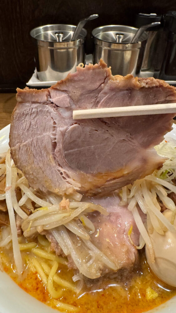 ▲横から見ると、麺の上にぶ厚めのチャーシュー、その上にもやしとネギが乗って標高が良い感じになっていることが分かります。