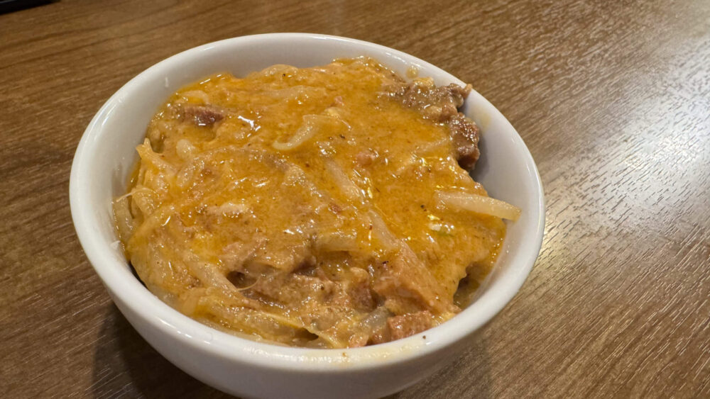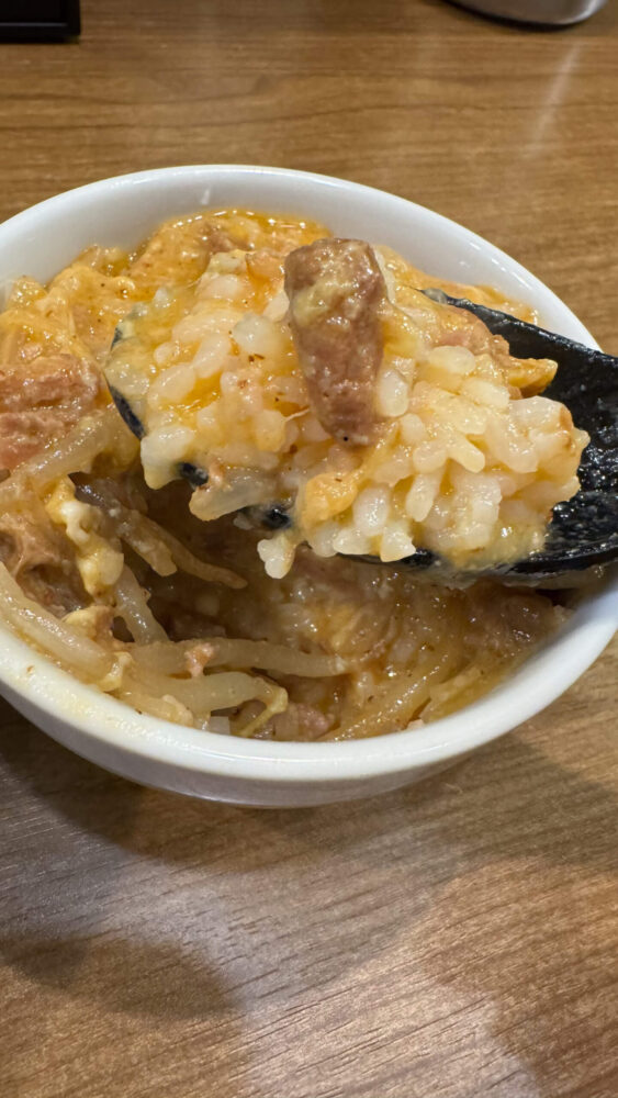 ▲ある程度上物を食べたら、二郎系のように天地返し。より玉子とじ感が強まります。