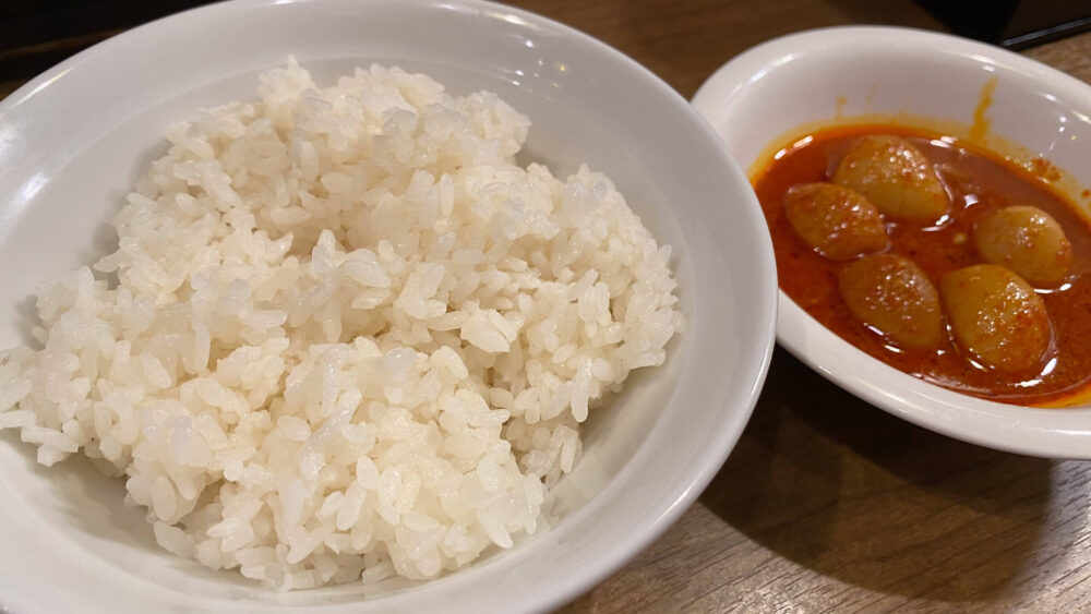 ▲ライスと辛子たまごも来ました。辛子たまごがめちゃくちゃ辛そう。