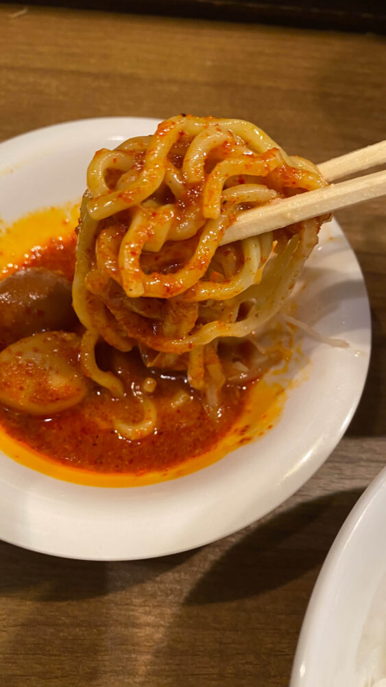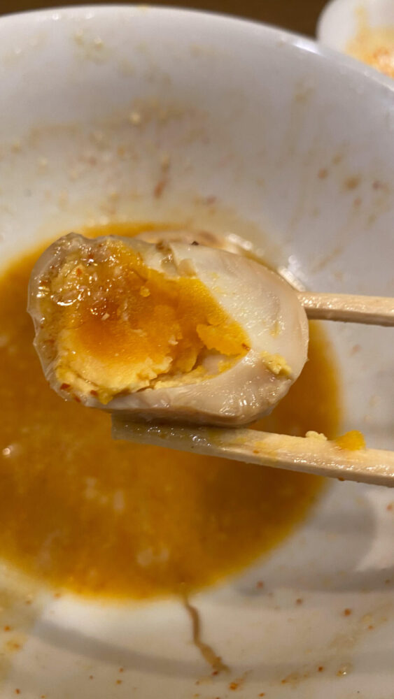 ▲辛子たまごのタレに麺をディップして味変。一気に辛さレベルが上がって、これまた美味しい。