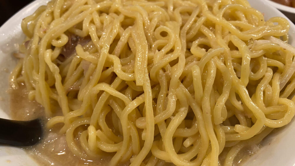 ▲ある程度上物を食べたら、二郎系のように天地返しして麺に集中していきます。特盛はすごいボリューム。