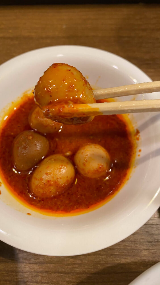 ▲辛子たまごは唐辛子漬けのうずら。蒙古タンメン中本の北極なみの辛さ。