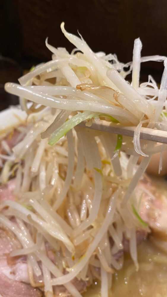▲炒められたもやしはシャキっと食感。ネギも良いアクセント。スープと合わせて食べると旨し。