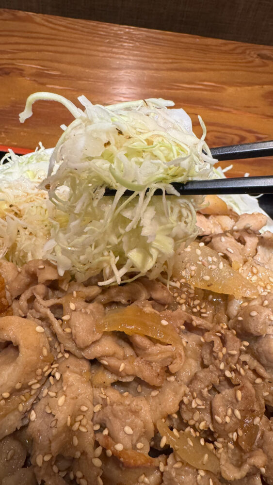 ▲逸る気持ちを抑え、キャベツでベジファースト。生姜焼きのタレを吸った部分はもはやおかず。
