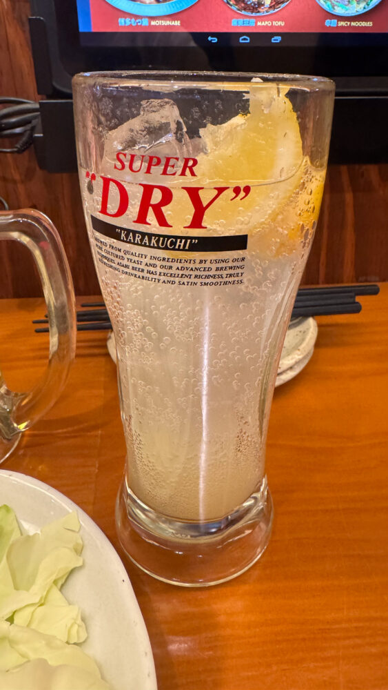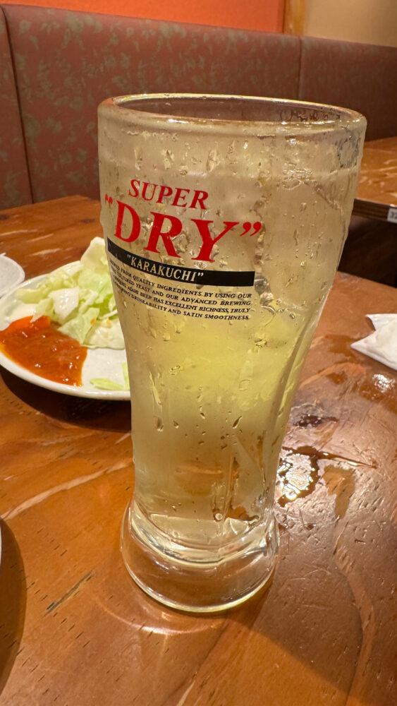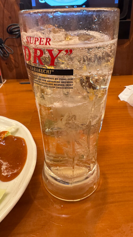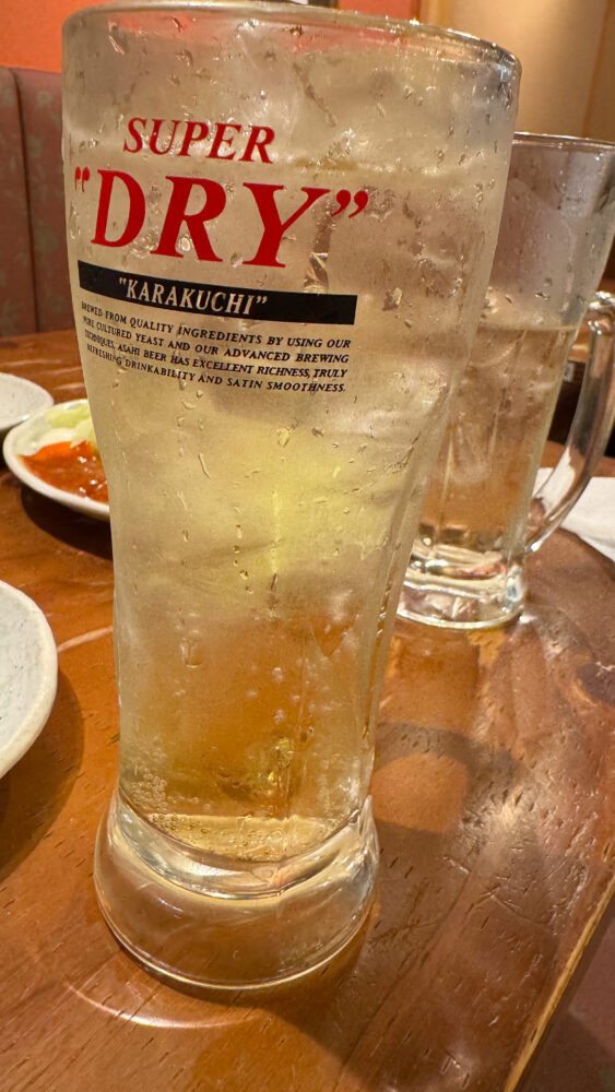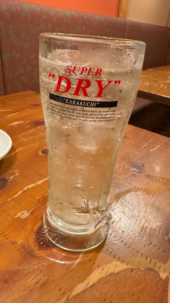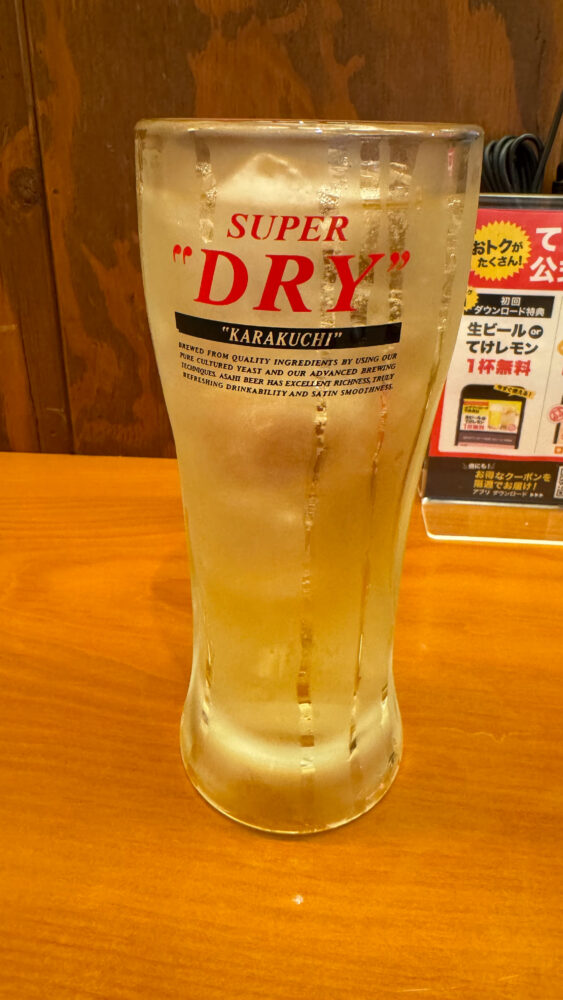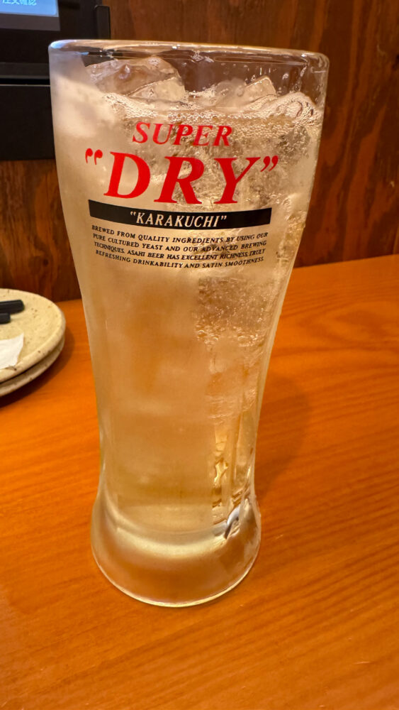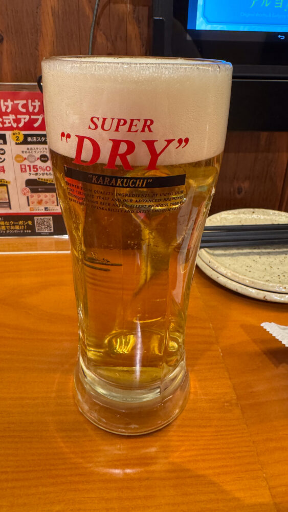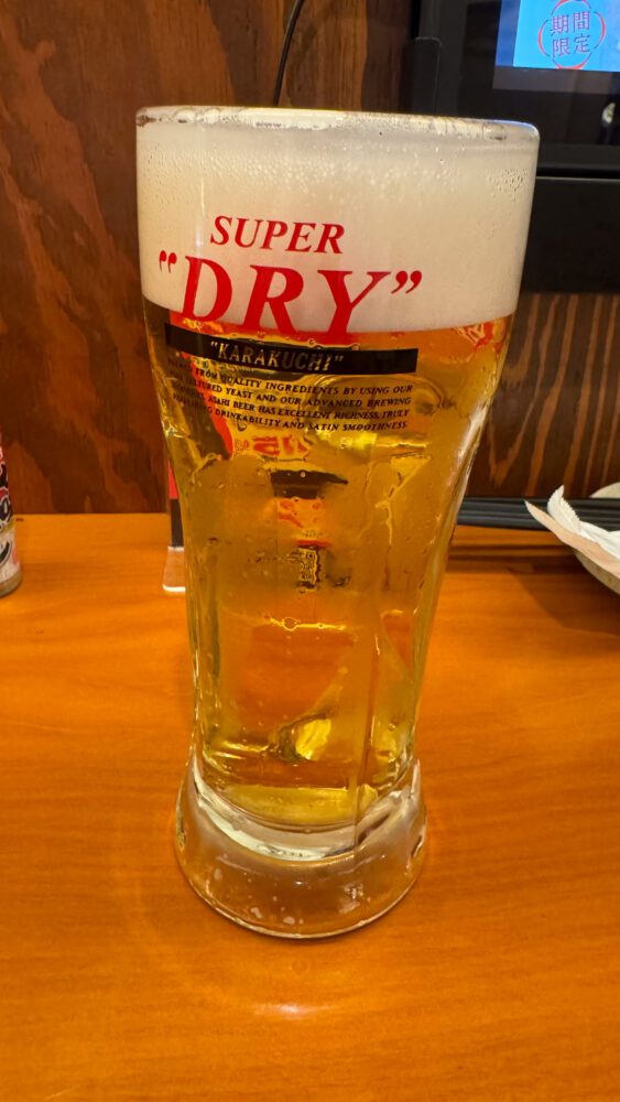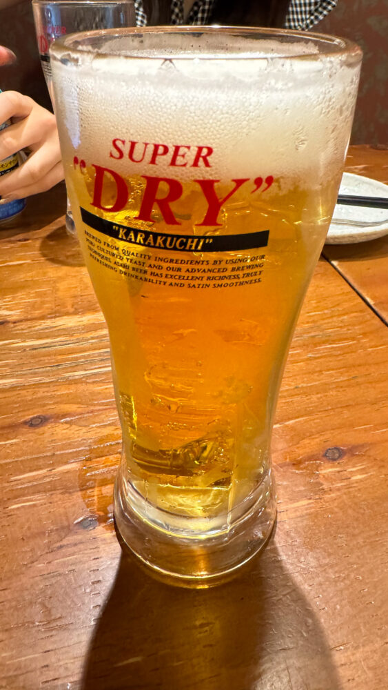 ▲1杯目はアサヒスーパードライ。1杯目の生ビールは安定の美味しさ。