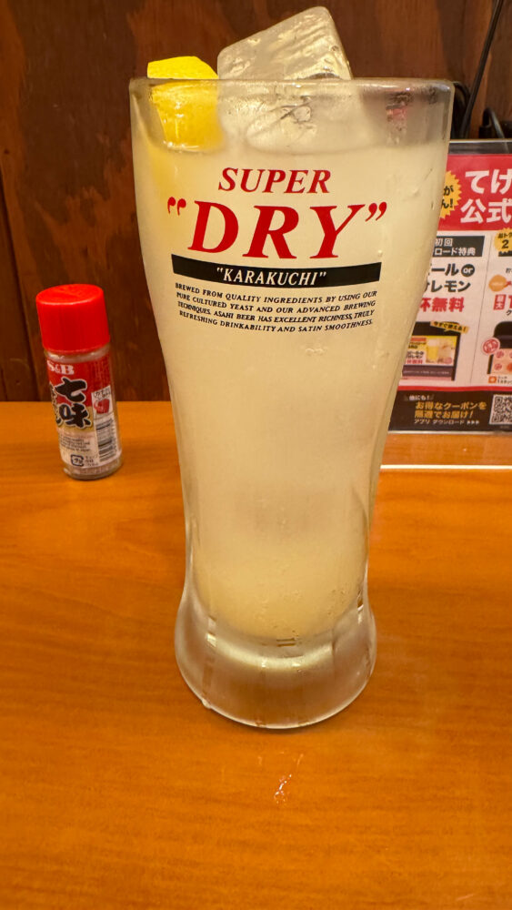 アサヒスーパードライ(ジョッキ)+強炭酸ハイボール×2+胡麻サーモン+極みの唐揚げ+てけレモン(2024年7月下旬)