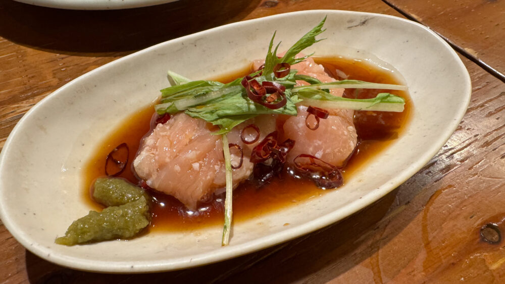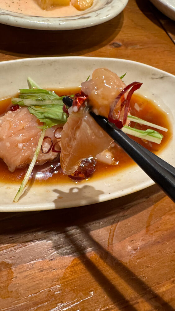▲鶏むねポン酢。レアっぽい鶏むね肉をポン酢で食べるタイプのメニュー。鷹の爪や柚子胡椒もあります。