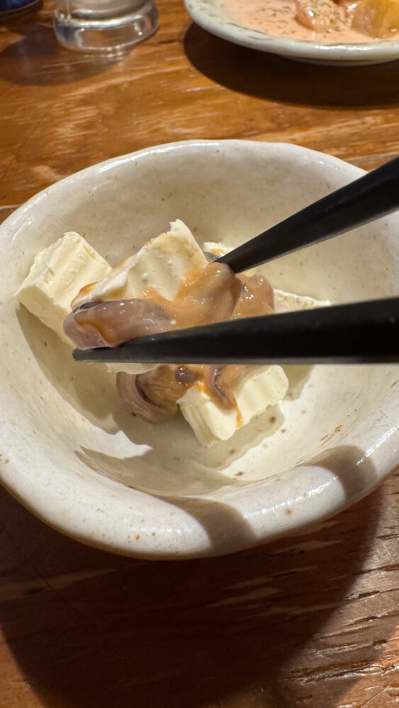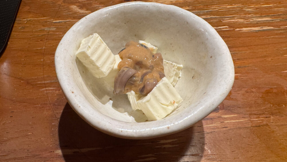 ▲塩辛のしょっぱさとクリームチーズの濃厚さがマッチして良い美味。良いお酒のアテ。