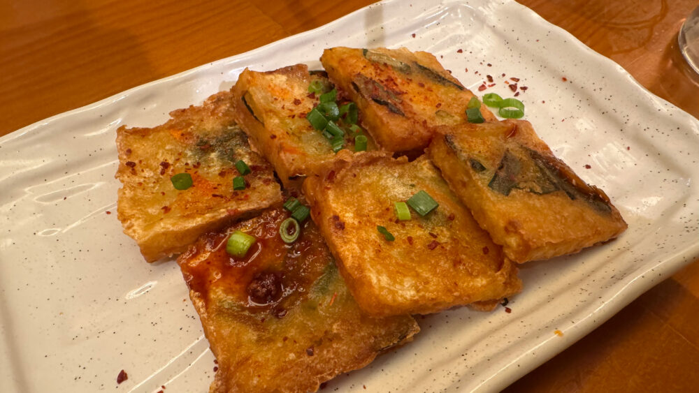 ▲カリカリ豚チヂミ。6枚にカットされ、甘辛なタレがかかっています。