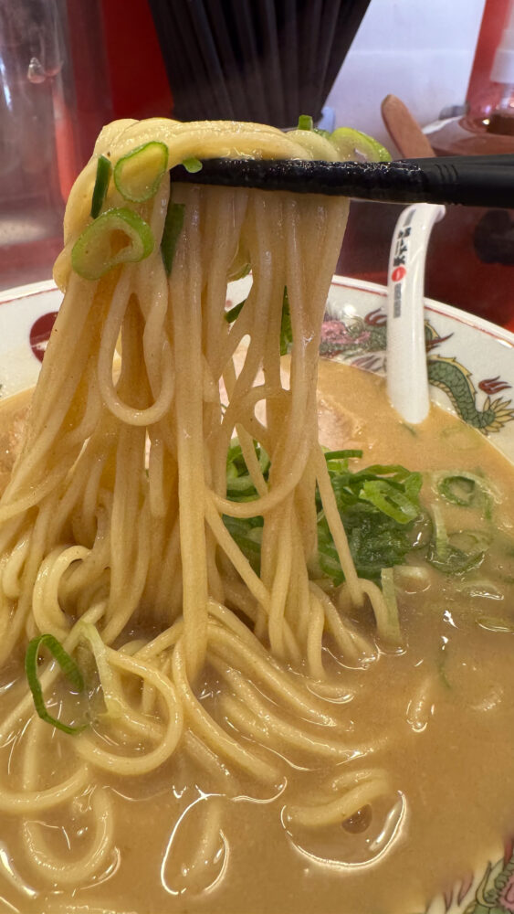 ▲麺はストレート気味の細麺。こってりスープが絡んで悪魔的に旨い。