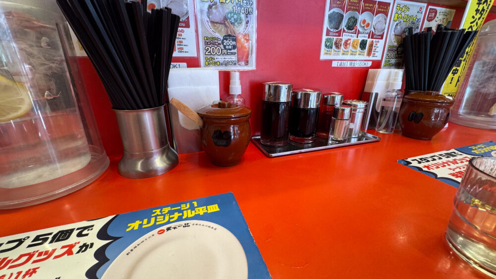 ▲卓上調味料はラーメンだれ、餃子のたれ、ラー油、胡椒、辛し味噌。
