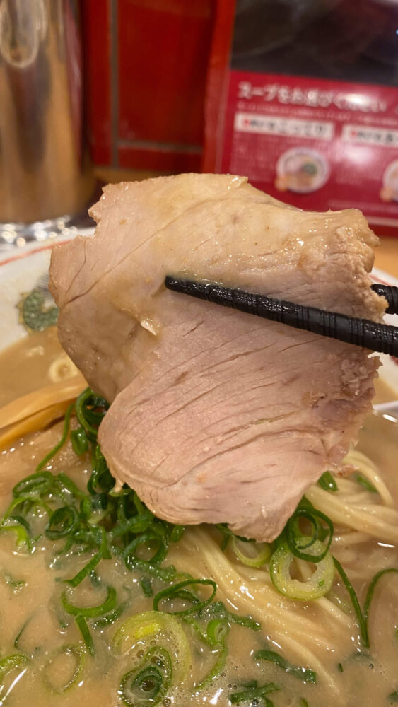 ▲チャーシューは脂身少なめですが、こってりスープにディップすると濃厚な味わいに。