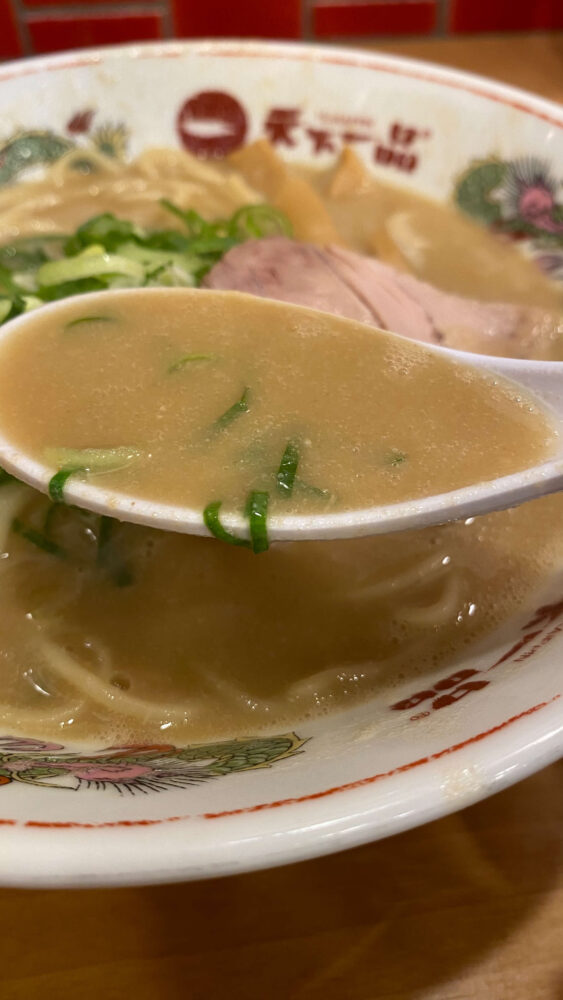 ▲天一といえばのこってりスープ。ポタージュ感満載。キムチと交互に味わうと無限ループできます。