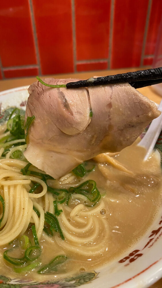 ▲チャーシュー。一般的なラーメン屋さんくらいのサイズ感ですが、こってりスープに浸すと最高。