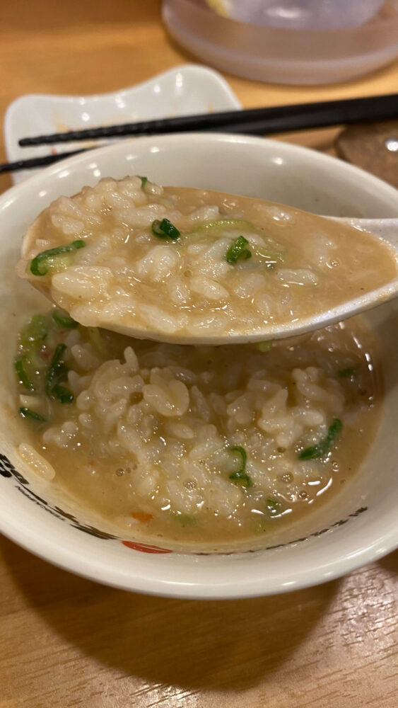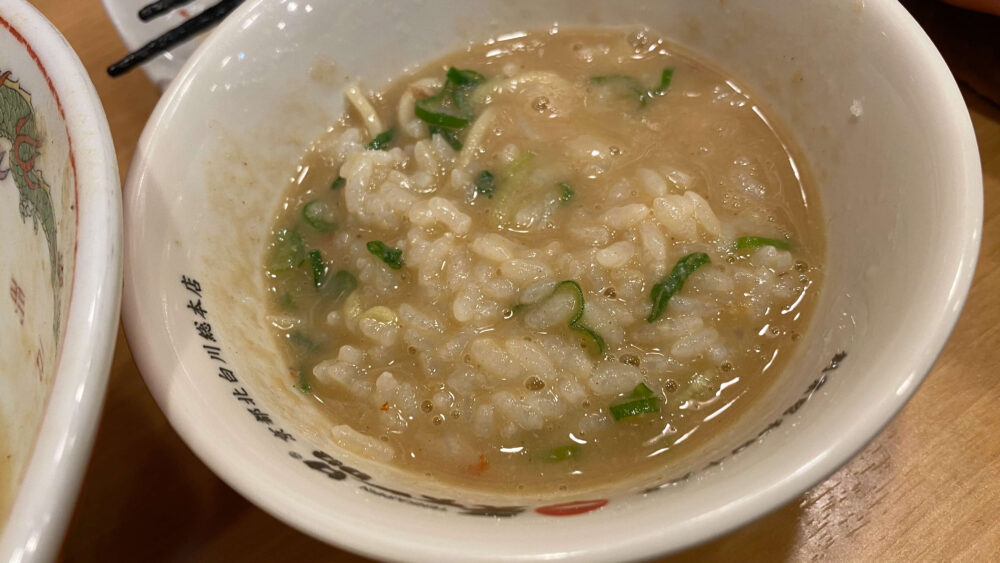 ▲麺を食べ終えたら、ライスへこってりスープを投入し雑炊風に。