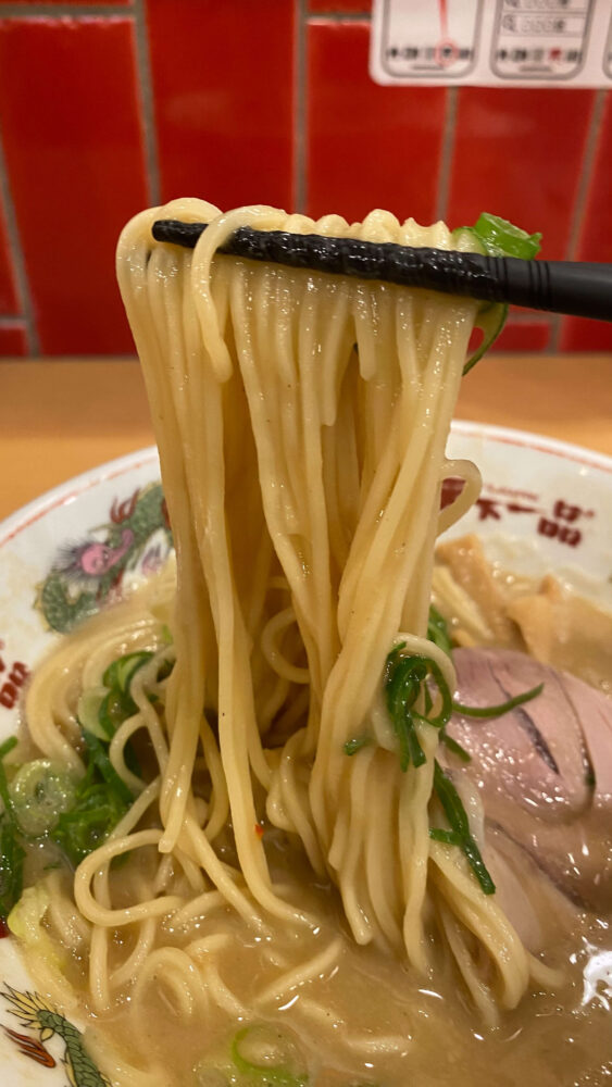 ▲細めのストレート麺がこってりスープを「これでもか!」と絡めてくれます。美味。