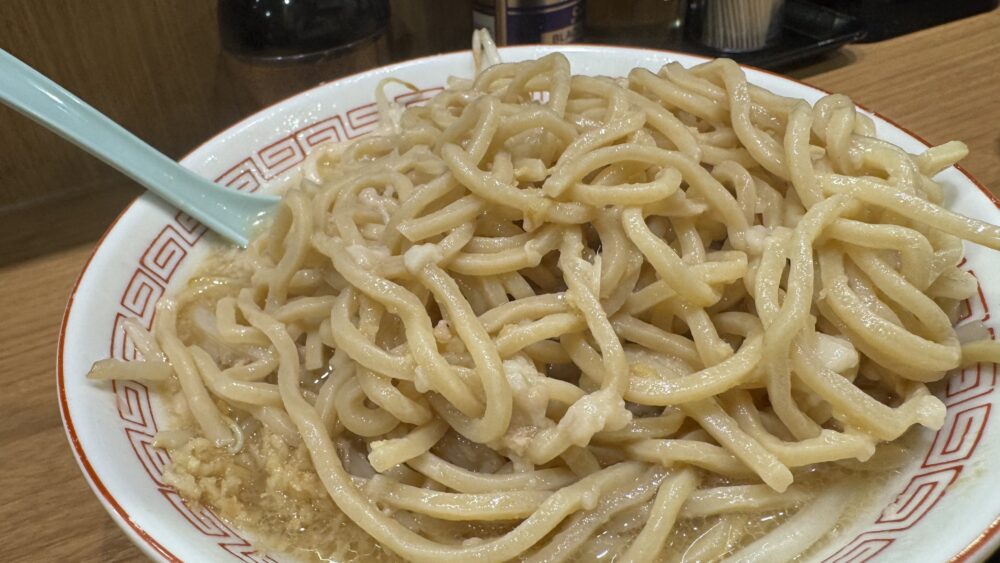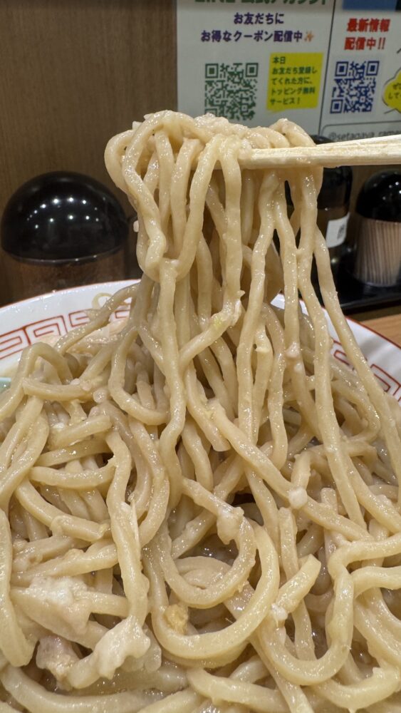 ▲麺は、二郎系ではやや細めですが、コシがあります。生姜が効いた塩スープが絡んで旨い。