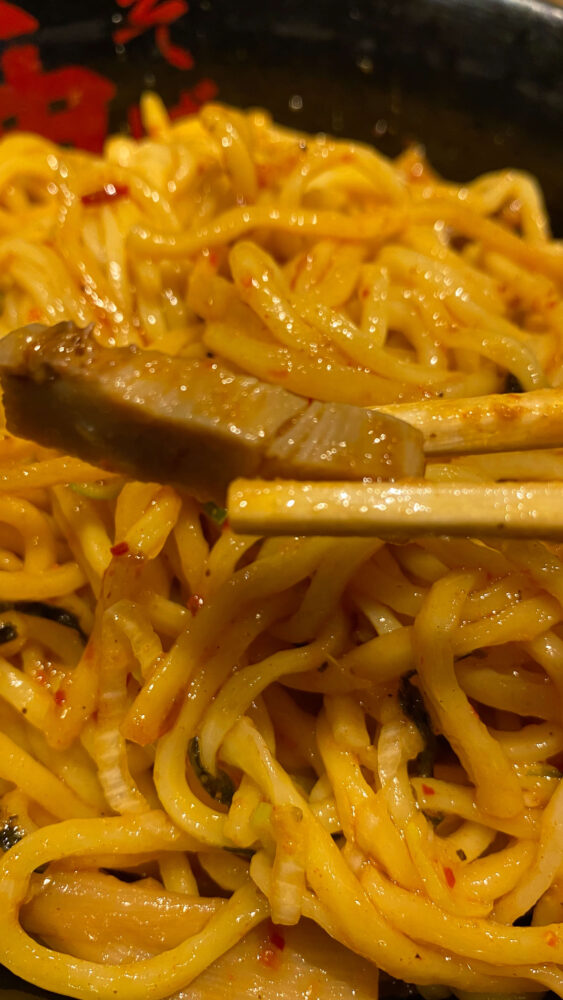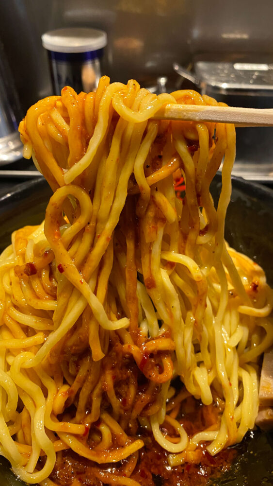 ▲これで準備万端。麺を食べるとモチモチな麺にピリ辛な味噌ベースのタレが絡んで美味。