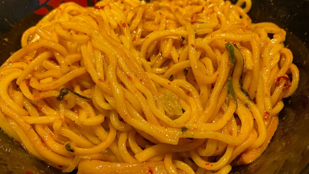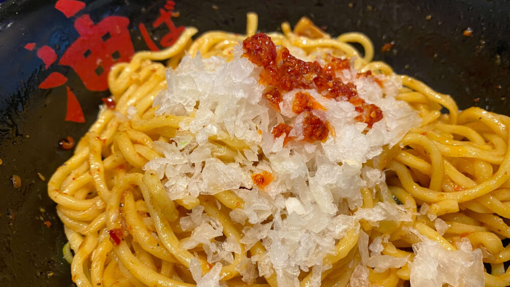 ▲卓上の刻み玉ねぎとラー油を投入して味変。さっぱり感と辛味がアップし、麺をすするスピードが加速。