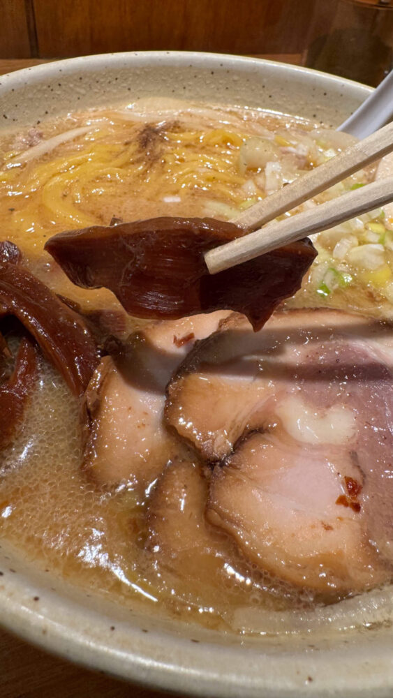 ▲黒めなメンマ。柔らかめで味はしっかりテイスト。やさしめのスープと対比があって良いですね。