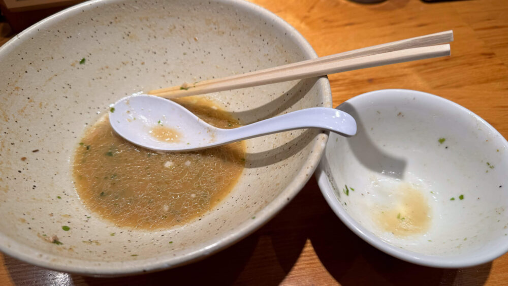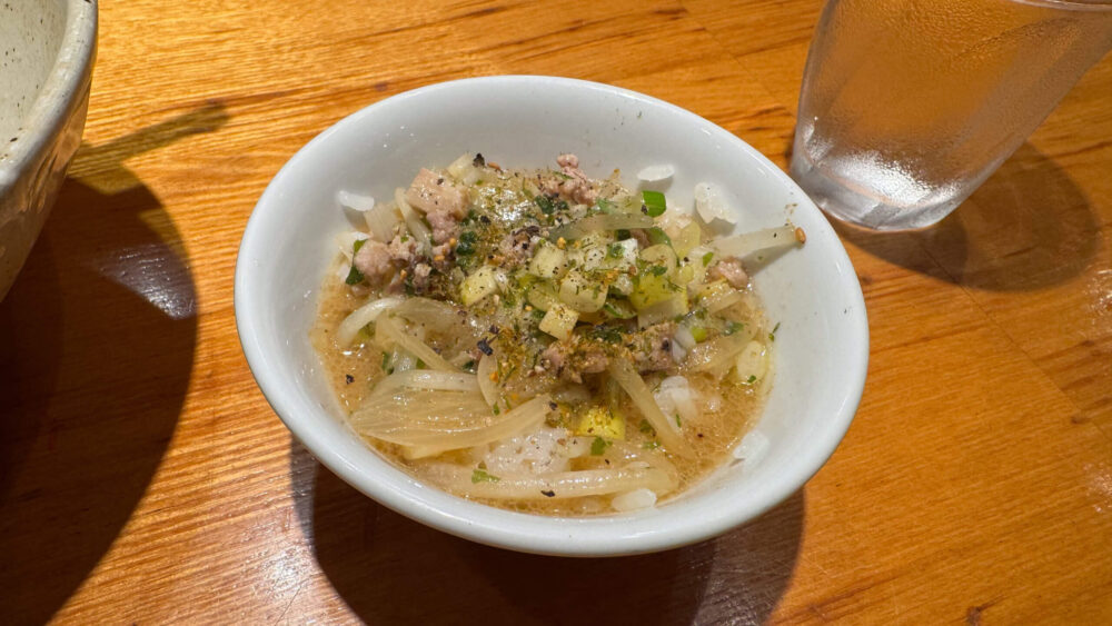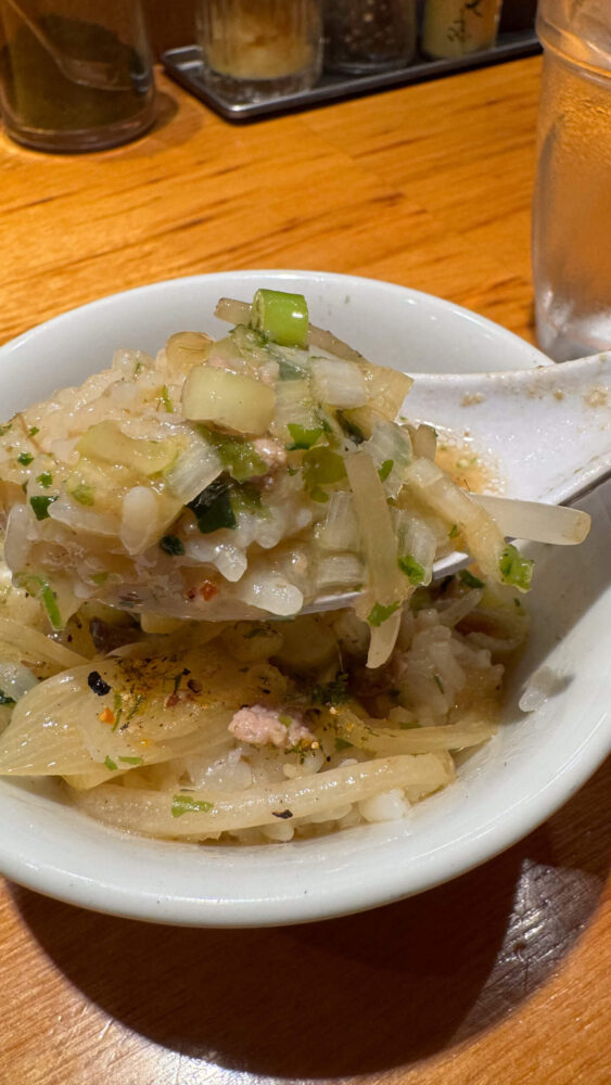 ▲ラーメンを食べ終えたら、残った具材とスープをライスへ投入し、卓上の胡椒と柚子七味をかけ、〆の雑炊が完成。