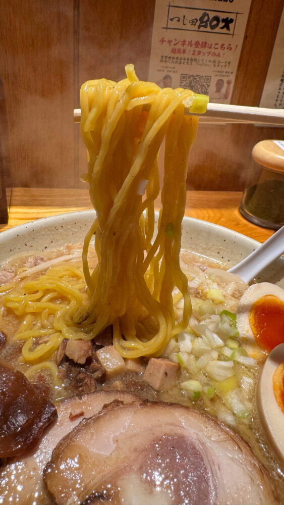▲麺はプリっとした黄色いちぢれ麺がスープに絡んで美味。