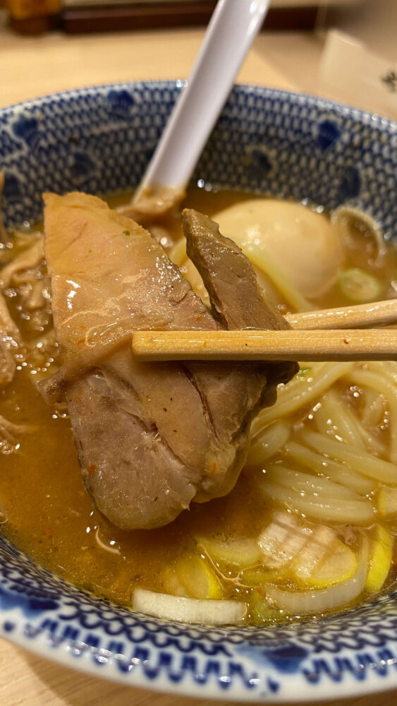 ▲豚崩以外にもチャーシューが入っていました。こちらは一般的なサイズ感でこれも良き。
