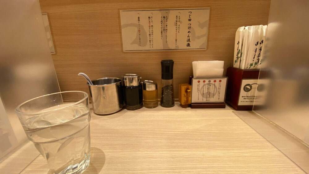 ▲卓上には黒七味や醤油、お酢など。「つじ田つけめん流儀」もしっかり明記されています。