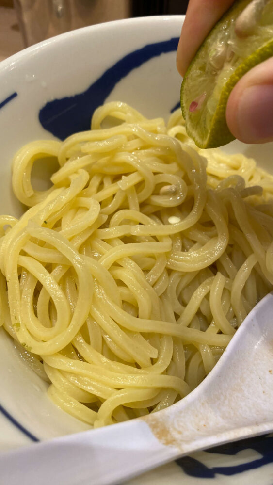 ▲つじ田つけめん流儀に則り、すだちで味変。柑橘系の清涼感マシマシで食欲が回復します。