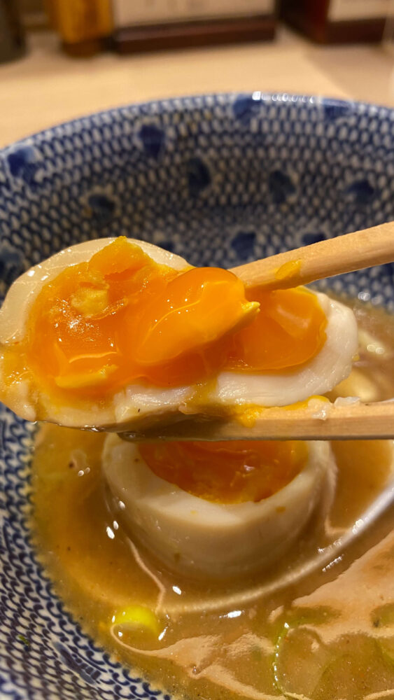 ▲味玉は半熟。つけ汁とともに呑みこむと最高です。
