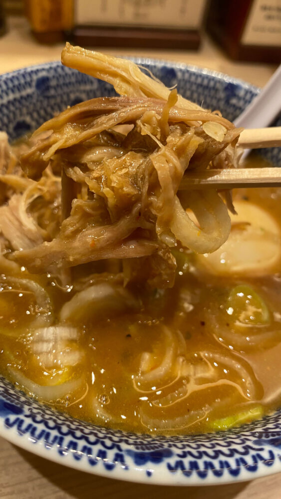 ▲豚崩。二郎系でいうところのほぐし豚みたいな感じですね。けっこう量が入っていて、つけ汁に浸して食べると濃厚で美味。