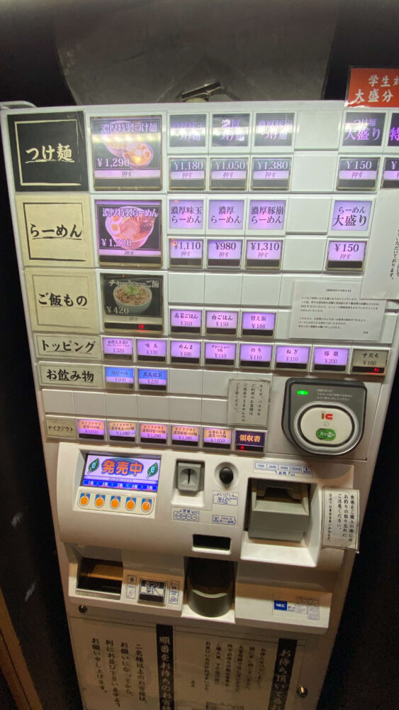 ▲店外の食券機で注文します。交通系電子マネーに対応しているのが嬉しい。