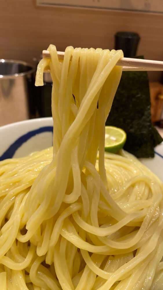 ▲つけ汁に麺を投入。つけ汁がめちゃくちゃ麺に絡んで美味しいです。