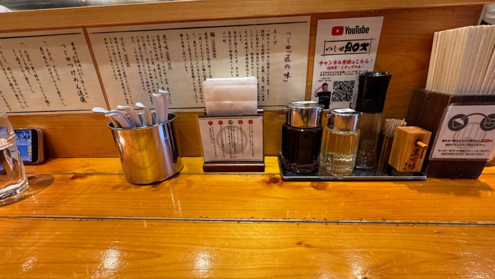 ▲卓上には黒七味や醤油、お酢など。「つじ田つけめん流儀」もしっかり明記されています。
