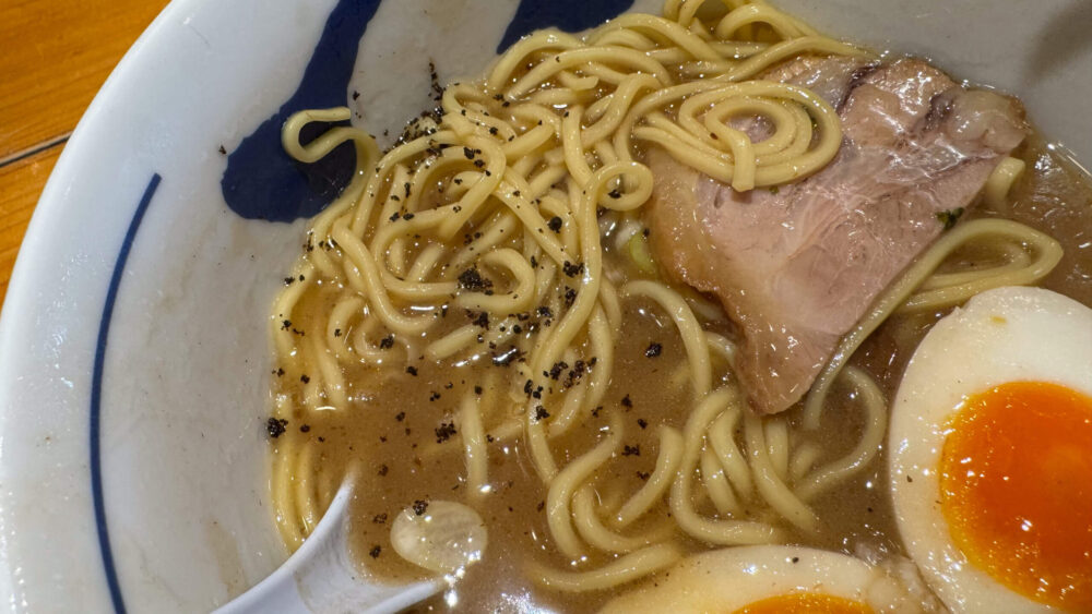 ▲卓上の黒七味で味変。通常の七味より風味が良く、辛さ抑え目。濃厚なスープに合いますね。