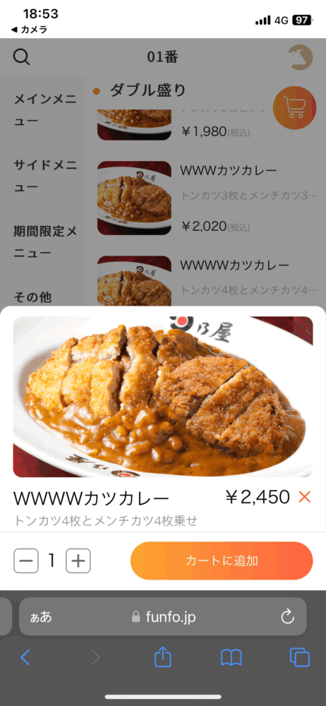 サイト上のメニュー名称は「WWWWカツカレー」ですが、食券機だと「アルティメットダブルカツカレー」です。