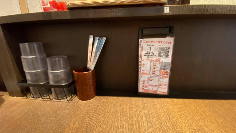▲現金以外の決済なら卓上のQRコードから行えます。卓上調味料は天かすガーリック、一味唐辛子、ソース。