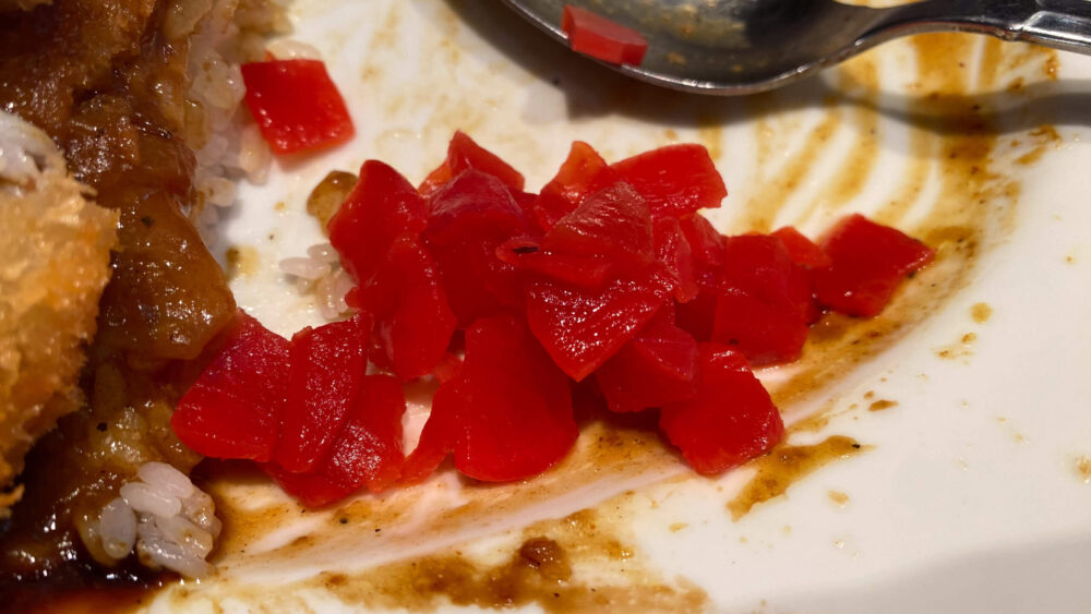 ▲そろそろ満腹なので福神漬けで味変。口の中がさっぱりして少しだけ復活。