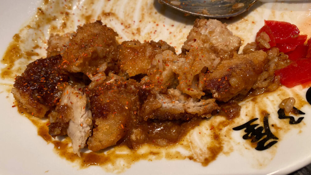 ▲揚げ物の残り1枚がきつくなったので小分けにし、卓上の一味唐辛子で辛さブースト!