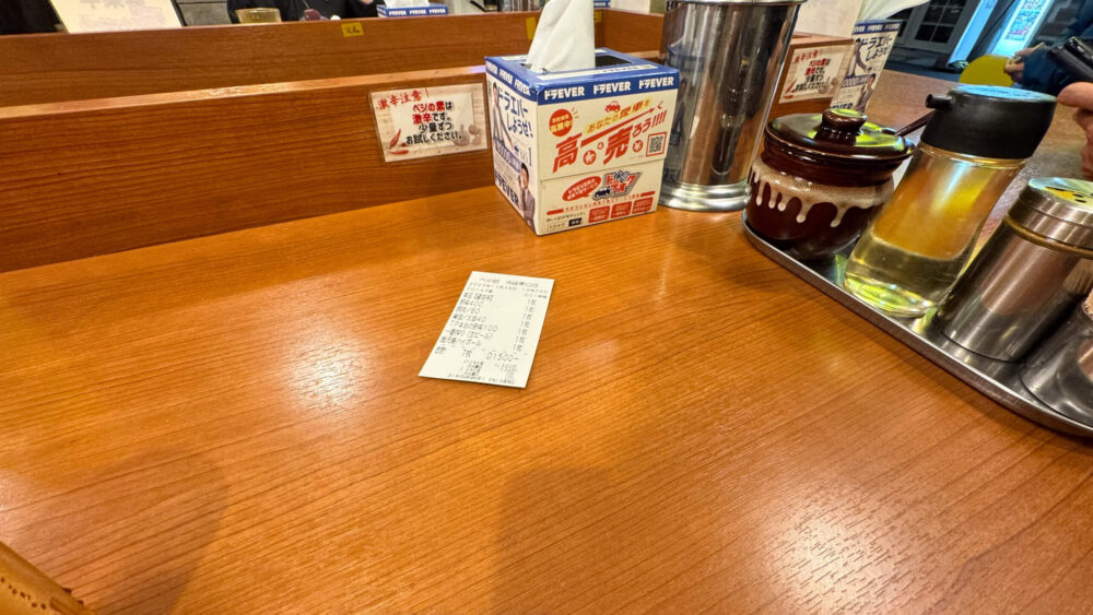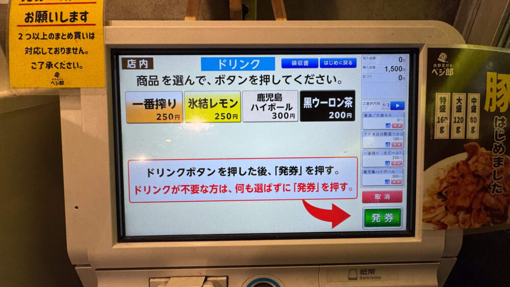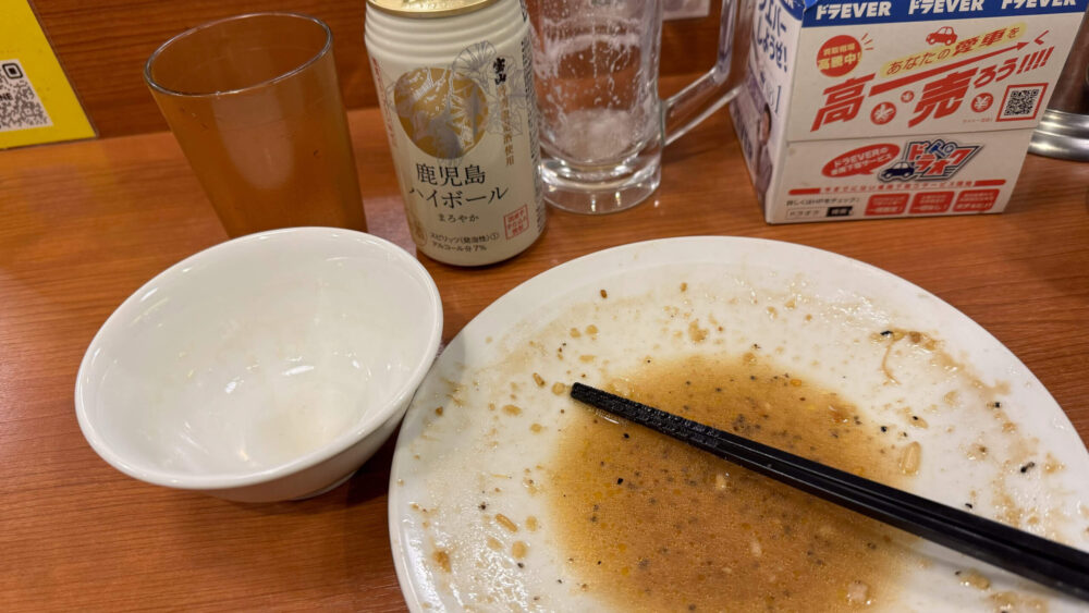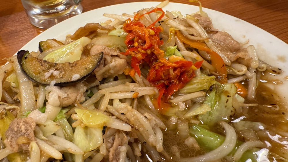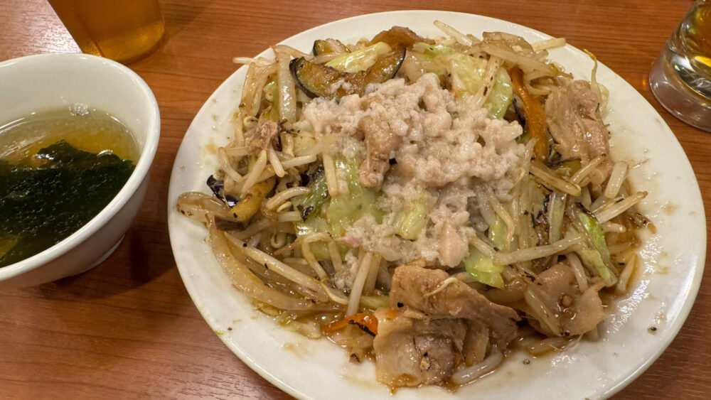 ▲この日は肉野菜炒め単品の醤油味(野菜400g/豚肉80g/背脂40g)(税込850円)+本日の野菜(ナス)(100円)+一番搾り(生ビール)(250円)+鹿児島ハイボール(300円)を注文。