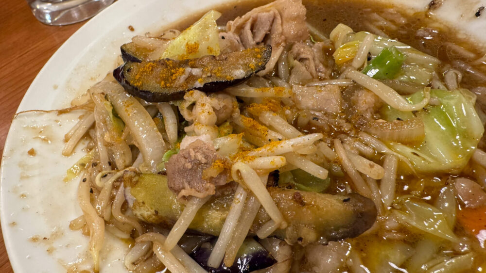▲終盤は卓上のカレー粉でスパイシーに味変。カレー味は食欲がめちゃ湧いて美味しい。