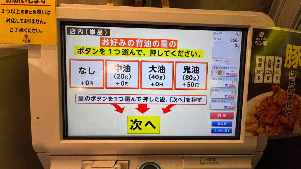 前回は肉野菜炒め定食塩とんこつ味(野菜マシ/肉普通/背脂大油/ご飯普通)+チャーシュー+一番搾り(生ビール)を楽しみました。