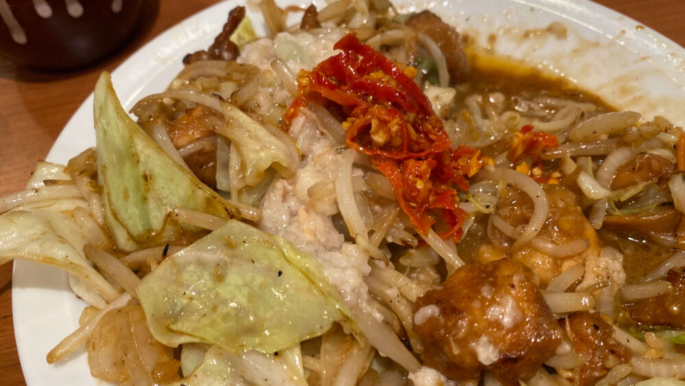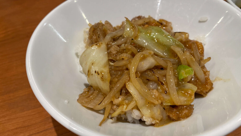 ▲ある程度肉野菜炒めを食べたら、ラストはご飯に残った具材と汁を投入し、雑炊風に。