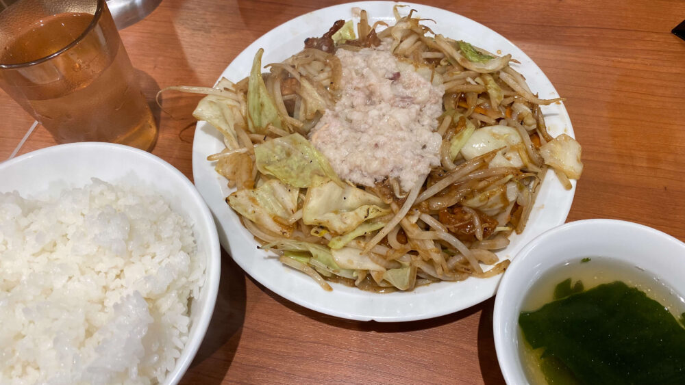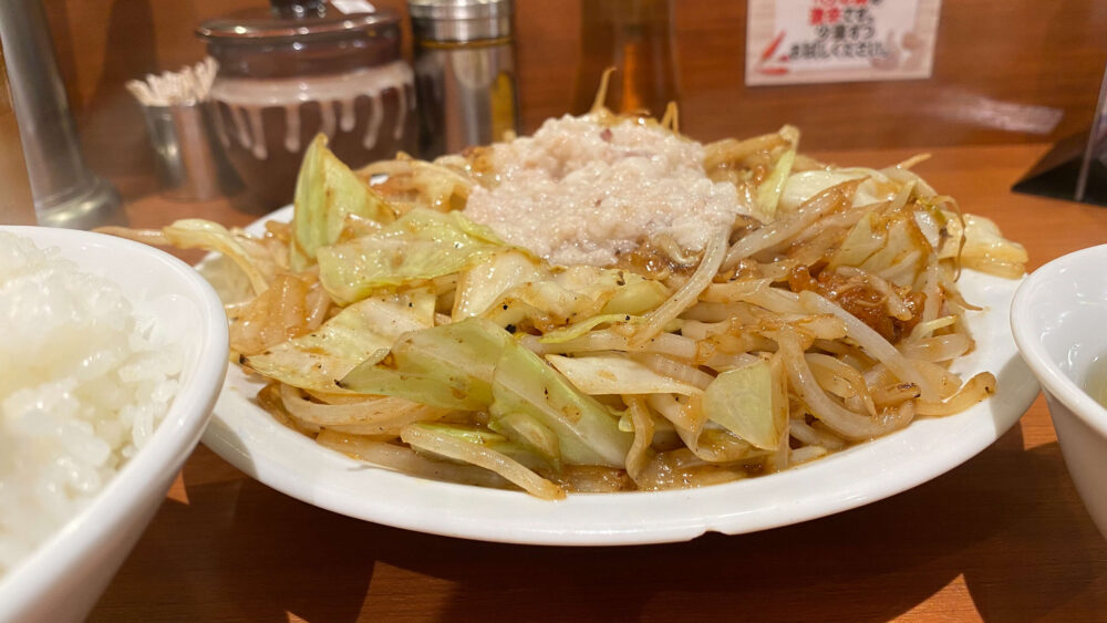 「肉野菜炒め定食味噌味/野菜マシ/肉中盛/背脂大油/ご飯特盛」を実食!