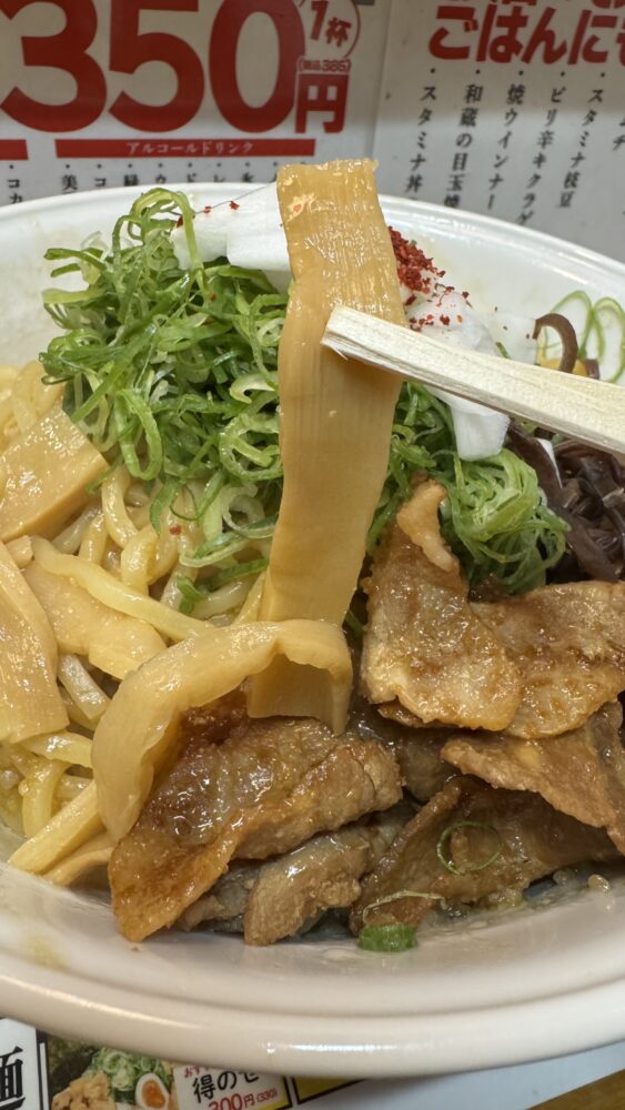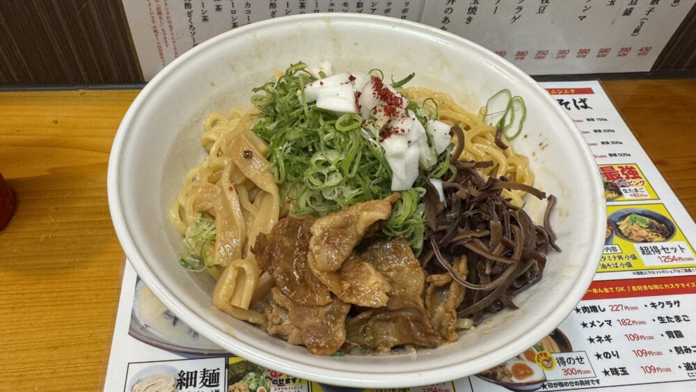 油そば ゴツ盛が着丼!豚肉にメンマ、ネギ、玉ねぎ、きくらげなど具材も豪華!