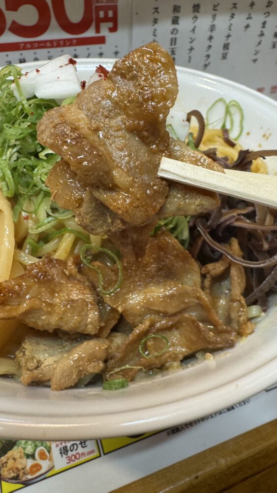 ▲豚肉は、背脂ニンニクで炒められており、しょっぱ旨。スタミナ丼と同じ味付けかも。