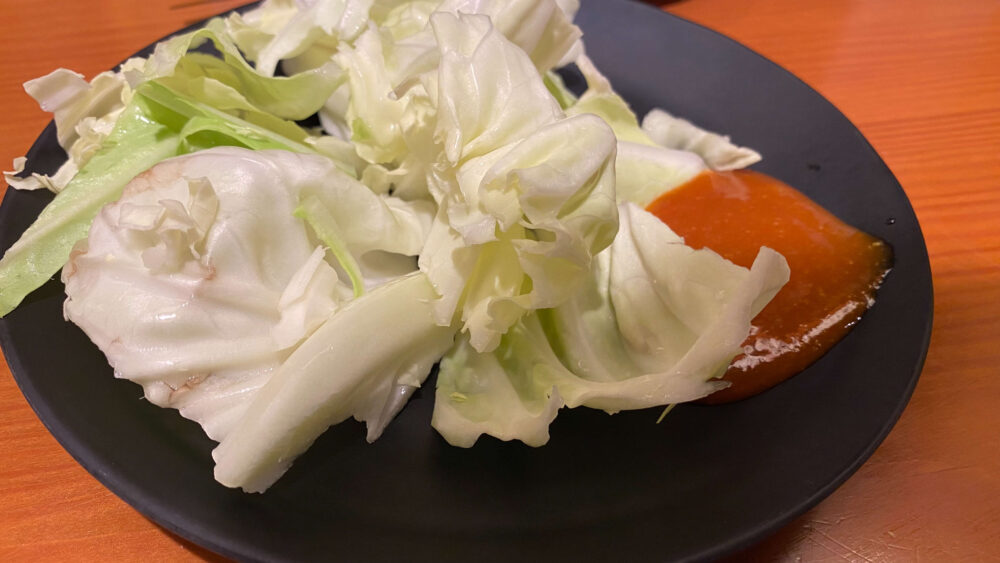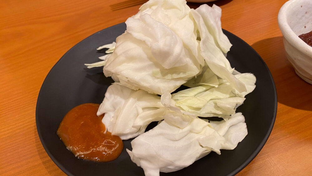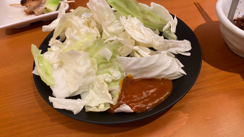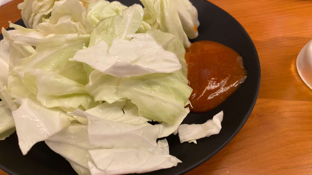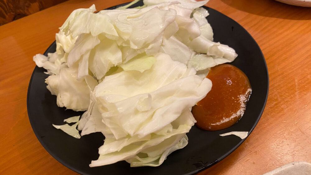 ▲味噌だれキャベツのお替り。無料ですが、タッチパネルで頼めないので店員さんへ直接お願いしましょう。