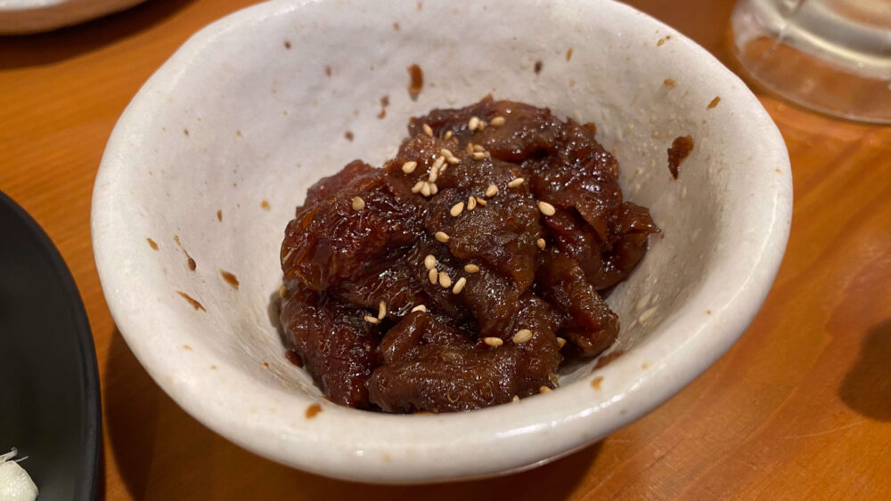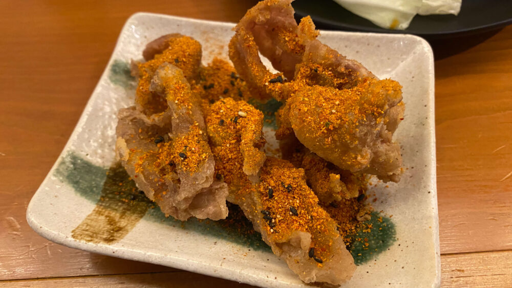 ▲甘辛やみつき鶏皮(税込319円)。メニュー名の通り、甘辛く煮込まれていて良いお酒のアテ。
